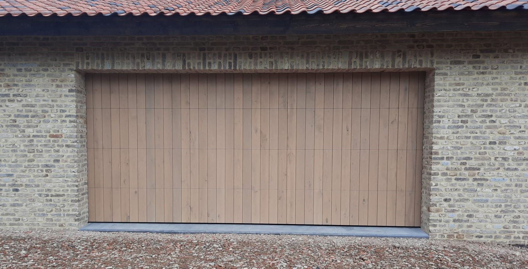 Om de landelijke stijl volledig door te trekken naar de garagepoort, bekleden we de geïsoleerde sandwichpanelen met duurzaam hout. Een sectionaalpoort in pastorijstijl word typisch gekenmerkt door de verticale lijnen in de panelen.